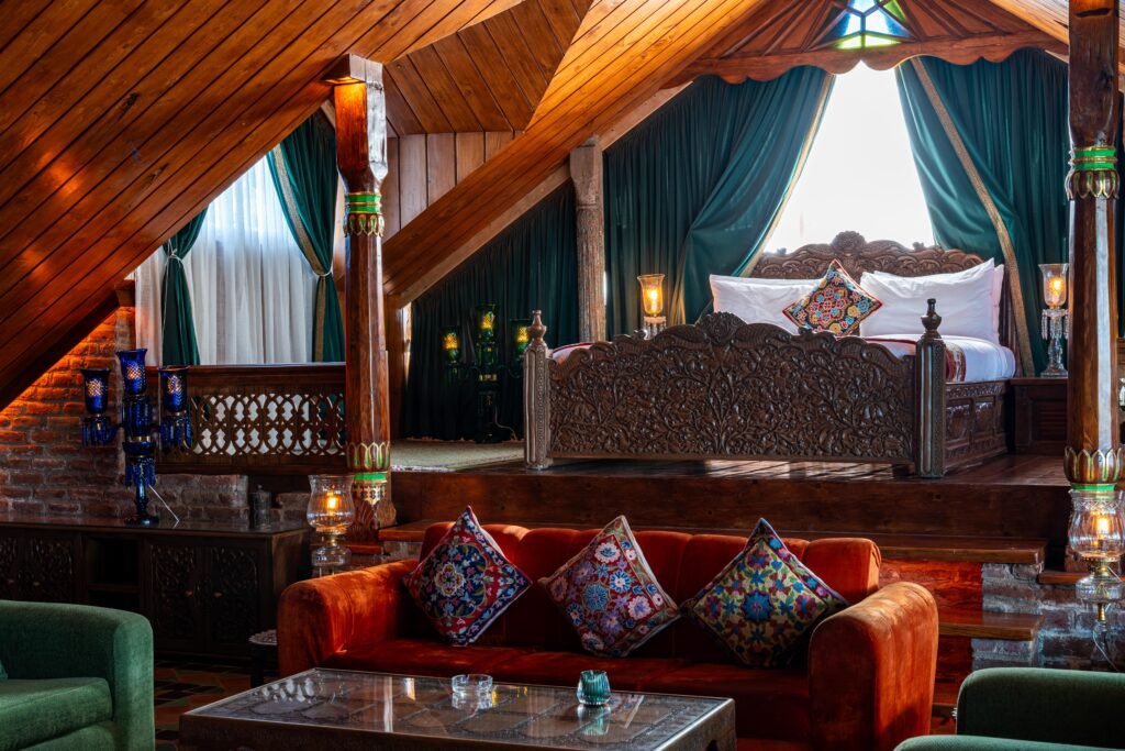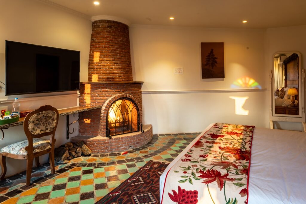The Heritage Room on the ground floor is ideal for guests who prefer easy accessibility without climbing stairs. Nestled almost within the garden, it offers a peaceful, intimate setting surrounded by greenery. Featuring centuries-old handmade Kashmiri tiles, the room reflects timeless craftsmanship while providing comfort, calm, and a close connection to nature.