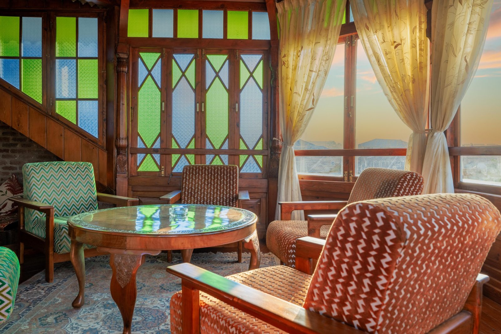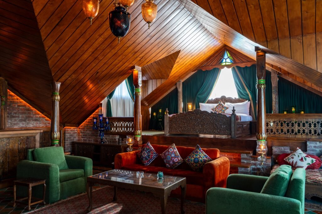 Rani Didda’s Suite is an expansive 800 sq. ft. space inspired by Mughal-era design, adorned with elegant chandeliers and timeless detailing. Occupying an independent floor, the suite opens onto a private terrace garden that offers sweeping views over Srinagar.