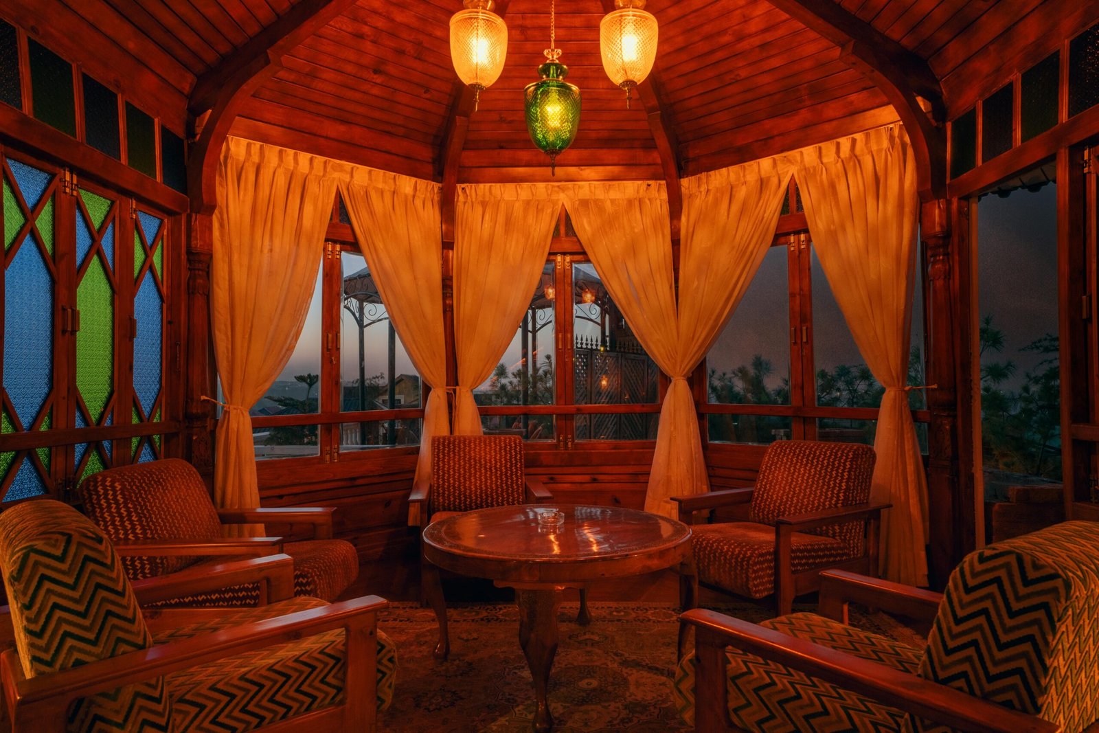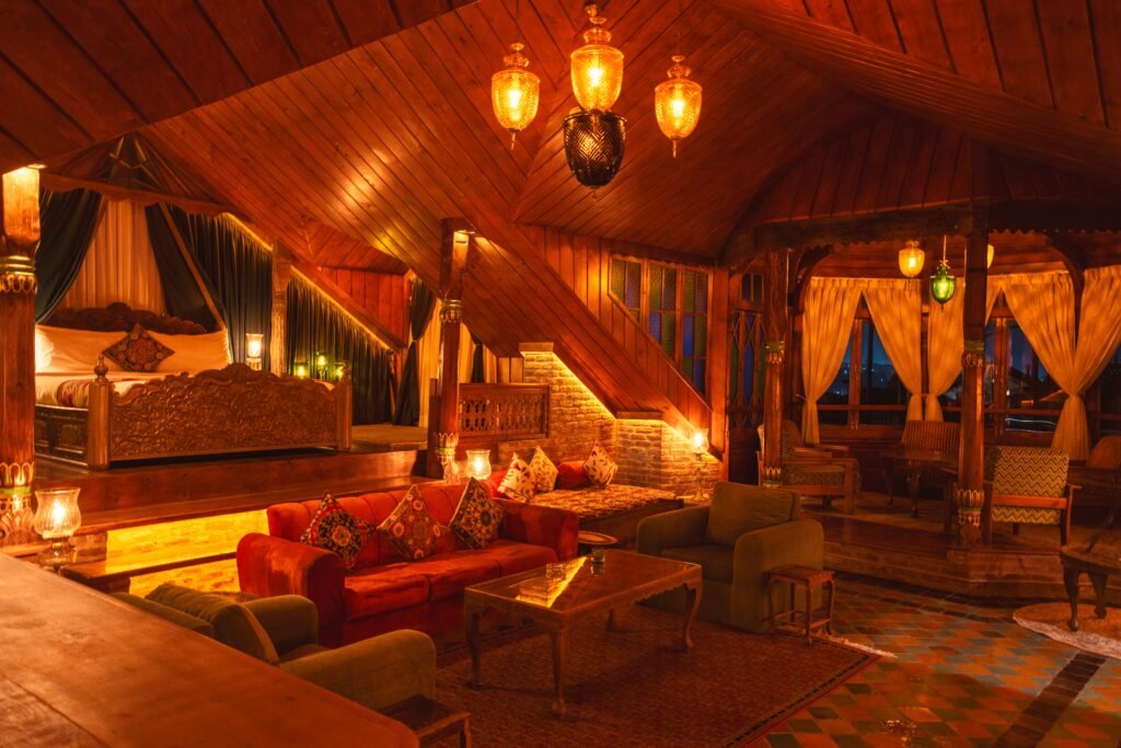 A real firewood fireplace warms and softly illuminates the room, creating an atmosphere that is deeply relaxing and inviting. The suite features handcrafted Kashmiri walnut wood furniture made by local artisans, adding authenticity and character to the space. Thoughtfully furnished with plush sofas, traditional deewans, and ample seating, it is ideal for hosting guests or spending unhurried time with family, blending grandeur with comfort in a truly regal setting.